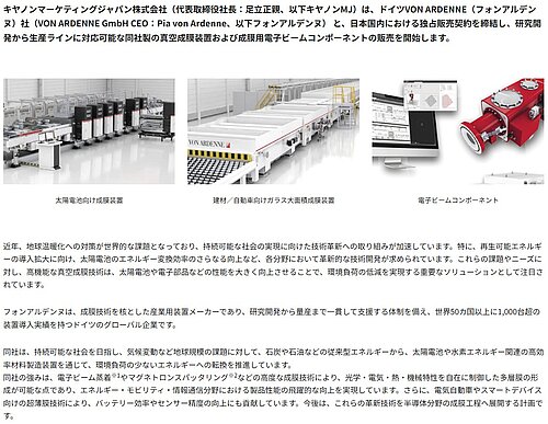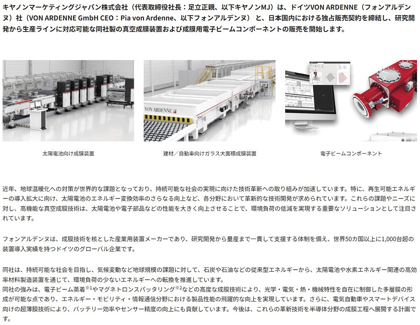 Within the framework of the agreement, Canon MJ will act as the primary contact for VON ARDENNE products starting January 1, 2026, and will support Japanese customers throughout the entire sales process of coating systems, components, upgrades, services, as well as spare and wear parts.